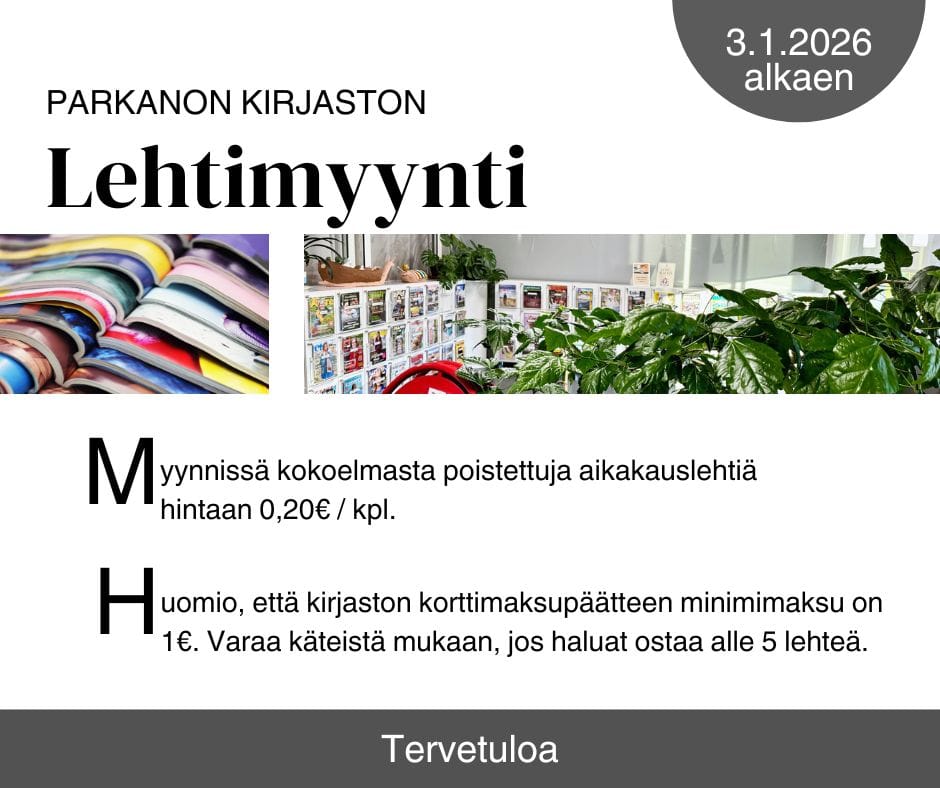 Kirjaston kokoelmasta poistettujen aikakauslehtien lehtimyynti alkaa! Lehtiä myydään hintaan 0,20€/kpl. Huomioi, että kirjaston korttimaksupäätteen minimimaksu on 1€. Lehtimyynti kestää joitakin viikkoja / niin kauan kuin lehtiä riittää. Tervetuloa ostoksille.