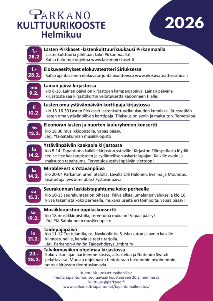 Etusivu | Tapahtumat | Helmikuun Kulttuurikooste Kulttuuritapahtumat 1.2.2026 – 28.2.2026 Klo: Helmikuun Kulttuurikooste Tervetuloa helmikuun kulttuuritapahtumien pariin! Jaa Facebook Threads X LinkedIn WhatsApp Kopioi Tulevat tapahtumat Tapahtuma alkaa: 1.1.2026 – Tapahtuma päättyy: 31.1.2026 Tammikuun Kulttuurikooste Tapahtuma alkaa: 10.1.2026 – Tapahtuma päättyy: 31.3.2026 LiikU talvella -kampanja Tapahtuma alkaa: 31.1.2026 – Tapahtuma päättyy: 1.2.2026 Parkanon koiranäyttely 2026 Parkanon urheilutalo, Niementie 10