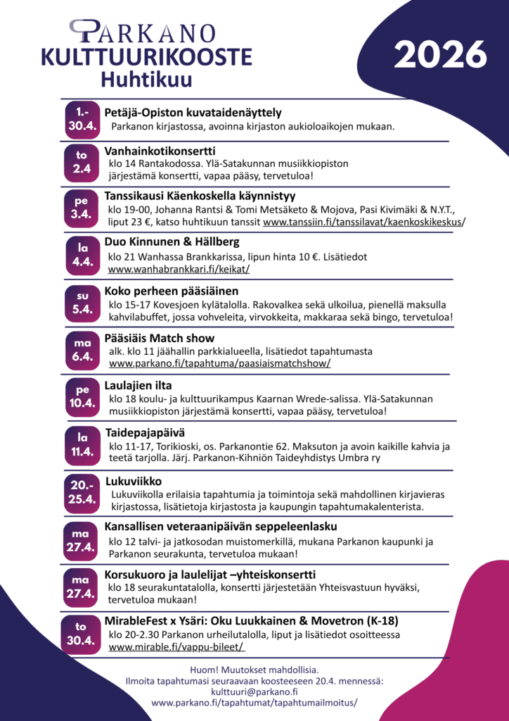 Etusivu | Tapahtumat | Huhtikuun Kulttuurikooste Kulttuuritapahtumat 1.4.2026 – 30.4.2026 Klo: Huhtikuun Kulttuurikooste Tervetuloa huhtikuun keväisten kulttuuritapahtumien pariin! Jaa Facebook Threads X LinkedIn WhatsApp Kopioi Tulevat tapahtumat Tapahtuma alkaa: 1.4.2026 – Tapahtuma päättyy: 30.4.2026 Huhtikuun Kulttuurikooste Tapahtuma alkaa: 9.4.2026 Parkanon maastopyöräreittien info- ja kuulemistilaisuus Parkanon kaupungintalon valtuustosali, Parkanontie 37 Tapahtuma alkaa: 11.4.2026 Taidepajapäivä Torikioski, Parkanontie 62