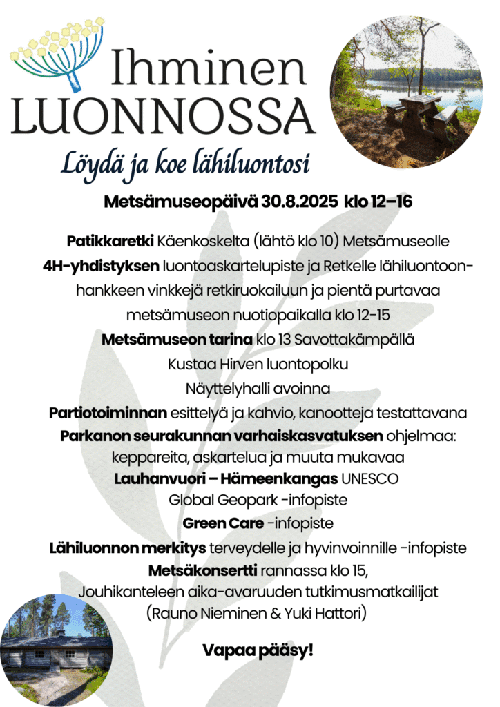 Etusivu | Tapahtumat | Ihminen luonnossa -tapahtuma Kulttuuritapahtumat Luonto ja ympäristö Yhteisötapahtumat 30.8.2025 Klo: 12:00 – 16:00 Ihminen luonnossa -tapahtuma Ihminen Luonnossa vuoden 2025 tapahtuman teemana on Löydä ja koe lähiluontosi. Luvassa on perinteinen metsämuseopäivä erilaisine ohjelmineen. Tapahtuma on kaikille avoin ja maksuton. Tervetuloa! Parkanon metsämuseo, Rännärinmuseotie 112, Parkano Jaa Facebook Threads X LinkedIn WhatsApp Kopioi Tulevat tapahtumat Tapahtuma alkaa: 1.1.2026 – Tapahtuma päättyy: 31.1.2026 Tammikuun Kulttuurikooste Tapahtuma alkaa: 10.1.2026 – Tapahtuma päättyy: 31.3.2026 LiikU talvella -kampanja Tapahtuma alkaa: 17.1.2026 Taidepajapäivä Torikioski, Parkanontie 62