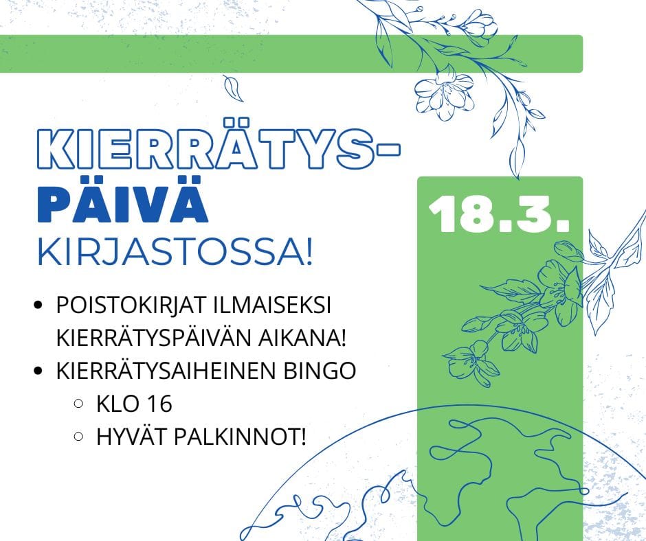 Etusivu | Tapahtumat | Kierrätyspäivä | Kirjasto Kirjasto 18.3.2026 Klo: 08:00 – 18:00 Kierrätyspäivä | Kirjasto Kansainvälistä kierrätyspäivää vietetään taas keskiviikkona 18.3.! Kirjastossa kierrätyspäivän aikana: poistokirjat veloituksetta, kierrätysaiheinen bingo klo 16. Tervetuloa Kierrätyspäivän viettoon. Parkanon kirjasto Jaa Facebook Threads X LinkedIn WhatsApp Kopioi Tulevat tapahtumat Tapahtuma alkaa: 10.1.2026 – Tapahtuma päättyy: 31.3.2026 LiikU talvella -kampanja Tapahtuma alkaa: 2.3.2026 – Tapahtuma päättyy: 28.3.2026 Juhael Mannisen valokuvanäyttely Parkanon kirjasto, Parkanontie 57 Tapahtuma alkaa: 9.3.2026 Kalenterimiitti | Kirjasto Parkanon kirjasto, Elämystila