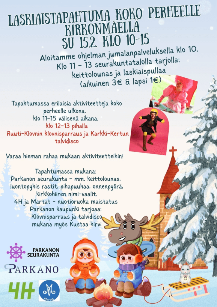 Etusivu | Tapahtumat | Koko perheen laskiaistapahtuma kirkonmäellä Lasten- ja perhetapahtumat 15.2.2026 Klo: 10:00 – 15:00 Koko perheen laskiaistapahtuma kirkonmäellä Tervetuloa mukaan! Parkanon seurakuntatalo, Kirkkopolku 3 Jaa Facebook Threads X LinkedIn WhatsApp Kopioi Tulevat tapahtumat Tapahtuma alkaa: 1.4.2026 – Tapahtuma päättyy: 30.4.2026 Huhtikuun Kulttuurikooste Tapahtuma alkaa: 18.4.2026 Salibandyturnaus P12 Loppuhuipentuma Koulu- ja kulttuurikampus Kaarna, Satakunnankatu 36-40 Tapahtuma alkaa: 20.4.2026 Kalenterimiitti | Kirjasto Parkanon kirjasto, Elämystila
