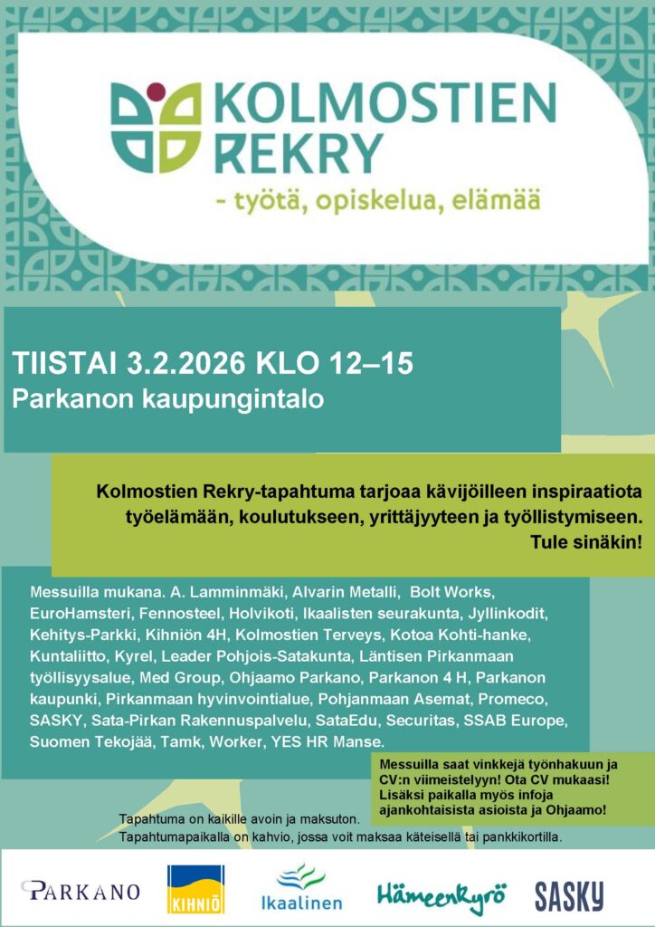 Etusivu | Tapahtumat | KOLMOSTIEN REKRY -tapahtuma Messut, markkinat ja myyjäiset 3.2.2026 Klo: 12:00 – 15:00 KOLMOSTIEN REKRY -tapahtuma Kolmostien Rekry-tapahtuma tarjoaa kävijöilleen inspiraatiota työelämään, koulutukseen, yrittäjyyteen ja työllistymiseen. Tule sinäkin! Parkanon kaupungintalo, Parkanontie 37 Jaa Facebook Threads X LinkedIn WhatsApp Kopioi Tulevat tapahtumat Tapahtuma alkaa: 1.1.2026 – Tapahtuma päättyy: 31.1.2026 Tammikuun Kulttuurikooste Tapahtuma alkaa: 10.1.2026 – Tapahtuma päättyy: 31.3.2026 LiikU talvella -kampanja Tapahtuma alkaa: 31.1.2026 – Tapahtuma päättyy: 1.2.2026 Parkanon koiranäyttely 2026 Parkanon urheilutalo, Niementie 10