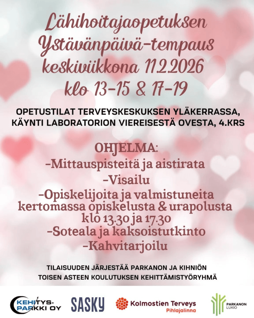 Etusivu | Tapahtumat | Lähihoitajaopetuksen Ystävänpäivä-tempaus Terveys ja hyvinvointi 11.2.2026 Klo: Lähihoitajaopetuksen Ystävänpäivä-tempaus Parkanon terveyskeskuksen yläkerta, Parkanontie 48 Jaa Facebook Threads X LinkedIn WhatsApp Kopioi Tulevat tapahtumat Tapahtuma alkaa: 10.1.2026 – Tapahtuma päättyy: 31.3.2026 LiikU talvella -kampanja Tapahtuma alkaa: 1.2.2026 – Tapahtuma päättyy: 28.2.2026 Helmikuun Kulttuurikooste Tapahtuma alkaa: 11.2.2026 Lähihoitajaopetuksen Ystävänpäivä-tempaus Parkanon terveyskeskuksen yläkerta, Parkanontie 48