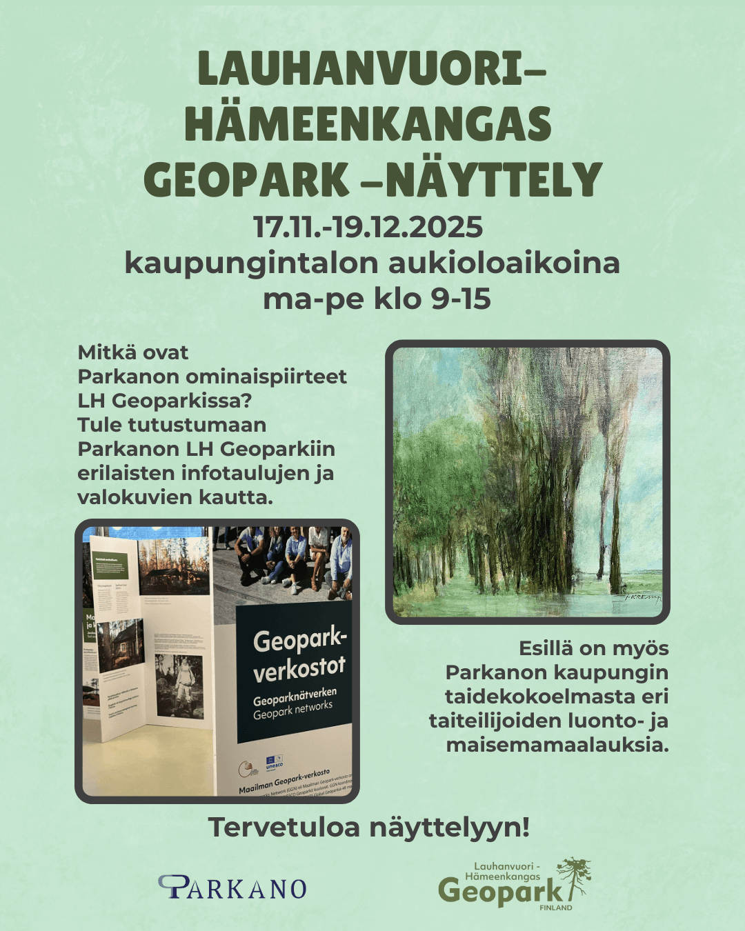 Etusivu | Tapahtumat | Lauhanvuori-Hämeenkangas Geopark -näyttely Näyttelyt ja museot 17.11.2025 – 19.12.2025 Klo: Lauhanvuori-Hämeenkangas Geopark -näyttely Kulttuuripalvelut Parkanon kaupungintalo, Parkanontie 37 Tervetuloa näyttelyyn! Jaa Facebook Threads X LinkedIn WhatsApp Kopioi Tulevat tapahtumat Tapahtuma alkaa: 1.11.2025 – Tapahtuma päättyy: 30.11.2025 Marraskuun Kulttuurikooste Tapahtuma alkaa: 17.11.2025 – Tapahtuma päättyy: 22.11.2025 Mielenterveysviikon tapahtumat | Kirjasto Parkanon kirjasto Tapahtuma alkaa: 17.11.2025 – Tapahtuma päättyy: 19.12.2025 Lauhanvuori-Hämeenkangas Geopark -näyttely Parkanon kaupungintalo, Parkanontie 37