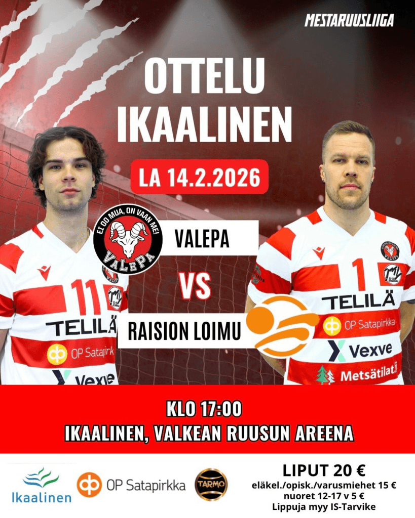 Pistetään reissua tarjolle lentopallopeliin Ikaalisiin. Kihniön vapaa-aikapalvelut ja Parkanon kaupungin vapaa-aikapalvelut järjestävät yhteistyössä reissun otteluun Valepa – Raision Loimu. Lippujen hinnat mainoksessa ja matkasta veloitetaan 5€/henkilö. Alle 12-vuotiaille reissu on ilmainen. Lähtö Kihniö kuntosalin piha 15.30 ja Parkano St1 klo 16. Sitovat ilmoittautumiset Jyrki Järventausta, 0405605864. Tervetuloa mukaan lentisbussiin!