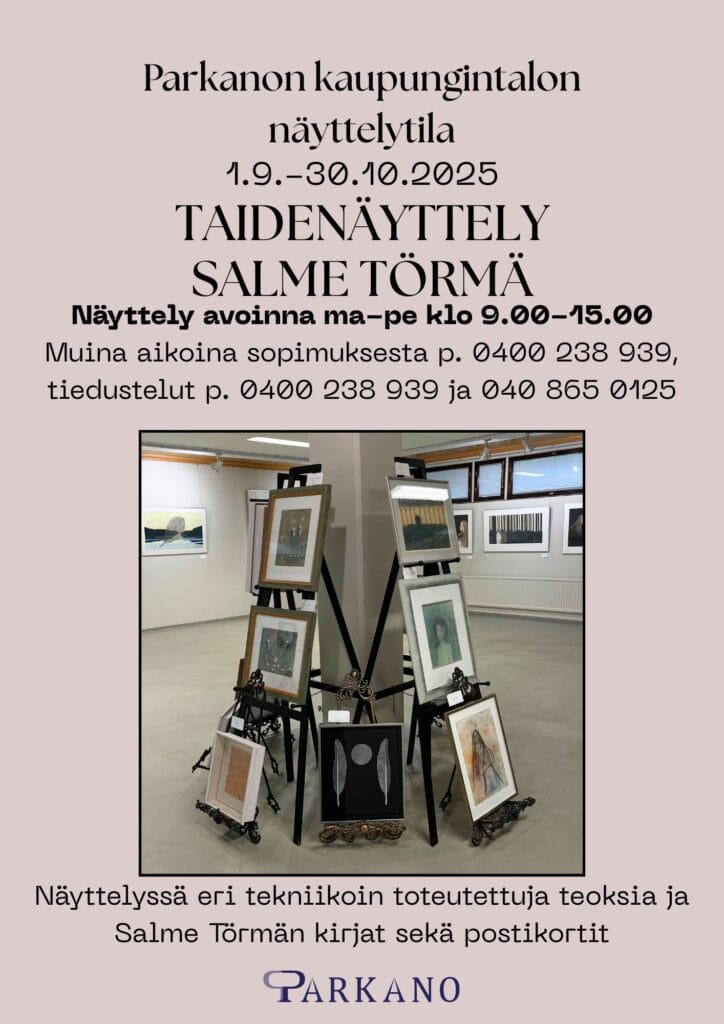 Etusivu | Tapahtumat | Taidenäyttely Salme Törmä Näyttelyt ja museot 1.9.2025 – 30.10.2025 Klo: Taidenäyttely Salme Törmä Parkanon kaupungintalon näyttelytilassa esillä Salme Törmän teoksia. Parkanon kaupungintalo, Parkanontie 37 Tervetuloa näyttelyyn! Jaa Facebook Threads X LinkedIn WhatsApp Kopioi Tulevat tapahtumat Tapahtuma alkaa: 1.9.2025 – Tapahtuma päättyy: 30.10.2025 Taidenäyttely Salme Törmä Parkanon kaupungintalo, Parkanontie 37 Tapahtuma alkaa: 1.10.2025 – Tapahtuma päättyy: 31.10.2025 MAAKOTKA ELINPIIRINSÄ RAJALLA -näyttely kirjastossa Parkanon kirjasto, Parkanontie 57, lehtilukusalil Tapahtuma alkaa: 17.10.2025 Matka Kunnonlähteelle | Parkanon Seudun Hengitysyhdistys Kunnonlähde, Kankaanpää
