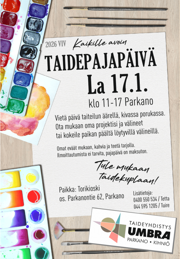 Tule taiteilemaan kivassa porukassa. Ota mukaan oma projektisi ja välineet tai kokeile paikan päältä löytyvillä välineillä ja materiaaleilla. Maksuton ja avoin kaikille. Kahvi+teetarjoilu.