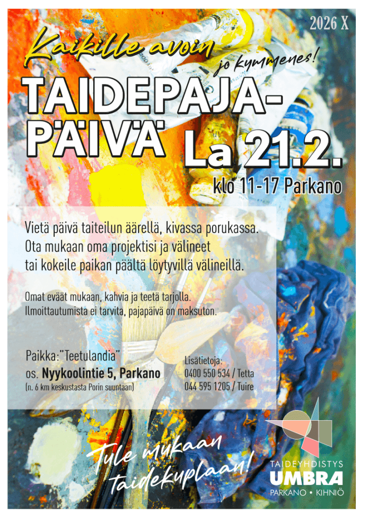 Etusivu | Tapahtumat | Taidepajapäivä Kädentaidot 21.2.2026 Klo: 11:00 – 17:00 Taidepajapäivä Päivä taidetyön äärellä kivassa porukassa! Ota mukaan oma projektisi ja välineet tai kokeile paikan päältä löytyvillä välineillä. Kahvia ja teetä tarjolla. Kaikille avoin, maksuton. Nyykoolintie 5 Jaa Facebook Threads X LinkedIn WhatsApp Kopioi Tulevat tapahtumat Tapahtuma alkaa: 10.1.2026 – Tapahtuma päättyy: 31.3.2026 LiikU talvella -kampanja Tapahtuma alkaa: 1.2.2026 – Tapahtuma päättyy: 28.2.2026 Helmikuun Kulttuurikooste Tapahtuma alkaa: 21.2.2026 Taidepajapäivä Nyykoolintie 5