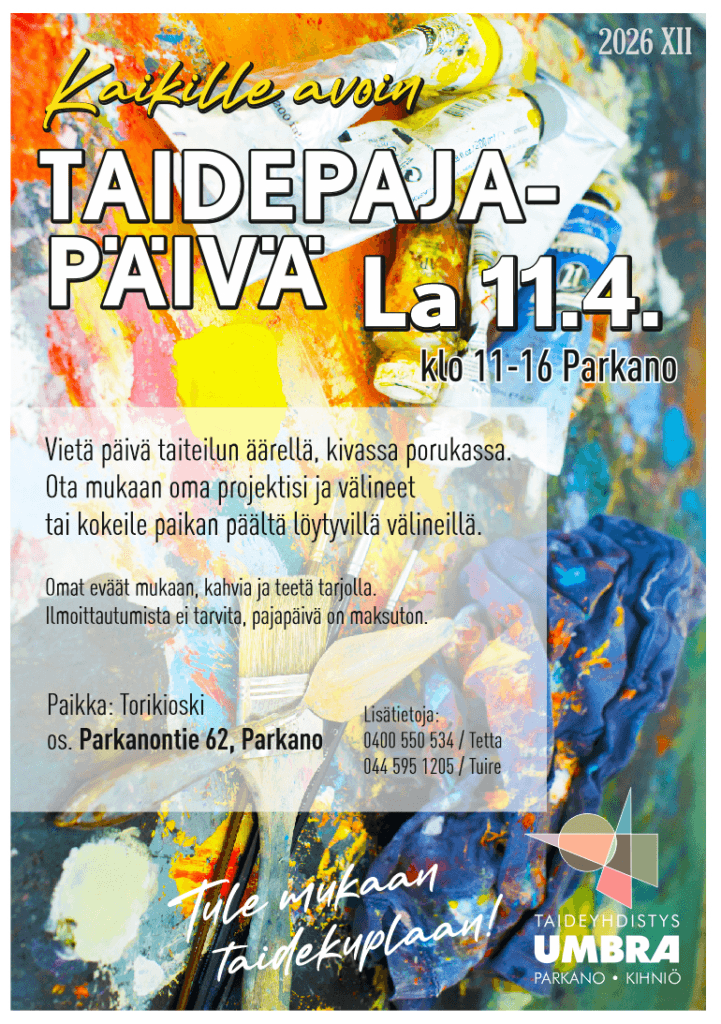 Etusivu | Tapahtumat | Taidepajapäivä Kulttuuritapahtumat 11.4.2026 Klo: 11:00 – 16:00 Taidepajapäivä Päivä taidetyön äärellä kivassa porukassa! Ota mukaan oma projektisi ja välineet tai kokeile paikan päältä löytyvillä välineillä. Kahvia ja teetä tarjolla. Kaikille avoin, maksuton. Torikioski, Parkanontie 62 Jaa Facebook Threads X LinkedIn WhatsApp Kopioi Tulevat tapahtumat Tapahtuma alkaa: 5.4.2026 Koko perheen pääsiäinen Kovesjoen kylätalo, Laholuomantie 180 Tapahtuma alkaa: 6.4.2026 PääsiäisMatchShow Parkanon jäähallin parkkialue, Koulukuja 1 Tapahtuma alkaa: 9.4.2026 Parkanon maastopyöräreittien info- ja kuulemistilaisuus Parkanon kaupungintalon valtuustosali, Parkanontie 37