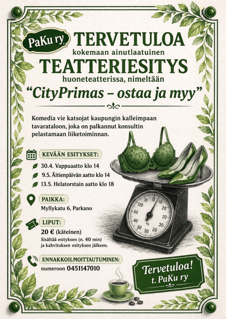 Etusivu | Tapahtumat | Teatteriesitys, huoneteatteri Teatteri ja esitykset 30.4.2026 Klo: 14:00 Teatteriesitys, huoneteatteri Esitämme komedian ” CityPrimas- ostaa ja myy” Näytelmä vie katsojat kaupungin kalleimpaan tavarataloon, joka on palkannut konsultin pelastamaan liiketoiminnan. Myllykatu 6, 39700 Parkano Jaa Facebook Threads X LinkedIn WhatsApp Kopioi Tulevat tapahtumat Tapahtuma alkaa: 1.4.2026 – Tapahtuma päättyy: 30.4.2026 Huhtikuun Kulttuurikooste Tapahtuma alkaa: 29.4.2026 Satutuokio | Kirjasto Parkanon kirjasto, Elämystila Tapahtuma alkaa: 30.4.2026 Teatteriesitys, huoneteatteri Myllykatu 6, 39700 Parkano