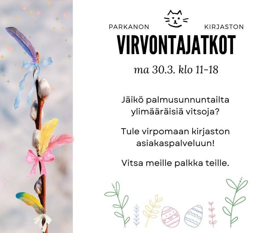 Tuliko tehtyä liikaa virpomisvitsoja? Tervetuloa virpomaan kirjaston asiakaspalveluun! Vitsa meille palkka teille.